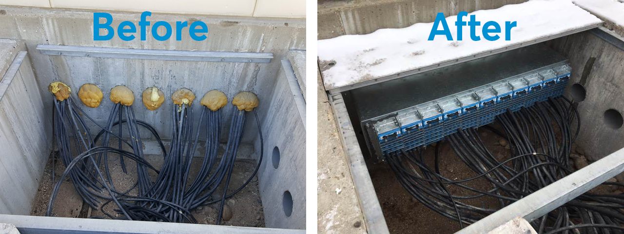 The solution was to replace the foam and steel wool around the 6-inch conduits with weather-tight and rodent-proof Roxtec transits. There was an average of ten cables in each conduit entering the control building.