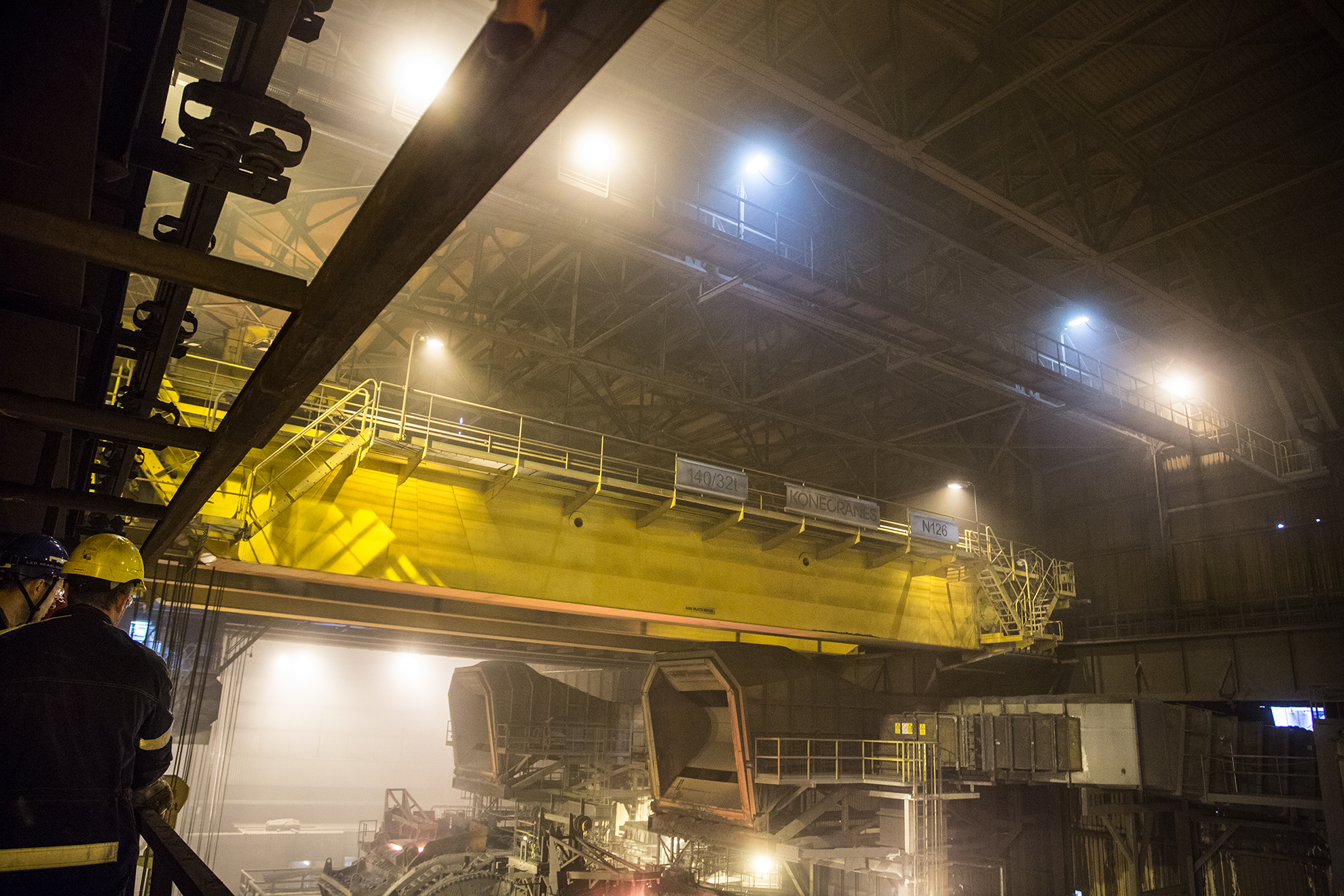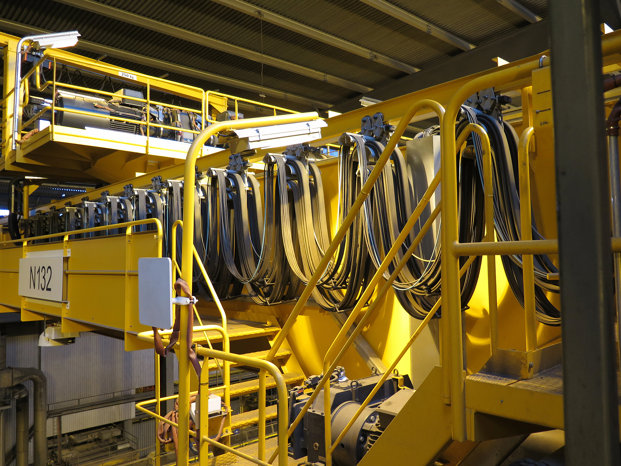 Pojízdné mostové jeřáby musejí být neustále v provozu. Přemisťují horké 25tunové ocelové tabule a zvládají 2,5 miliónu tun ročně.