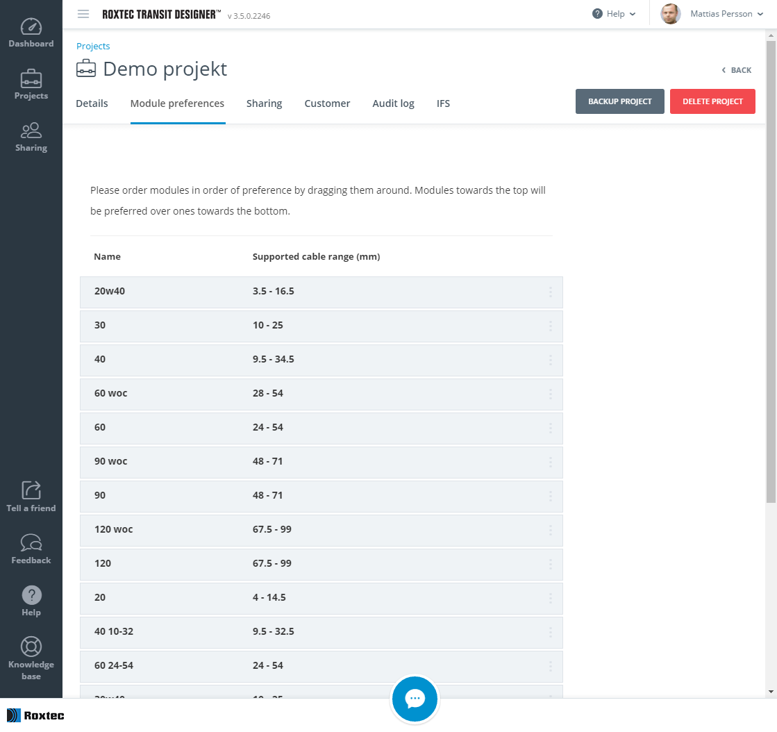 Wenn es mehr als ein Modul gibt, das für das Kabel oder Rohr passen würde, folgt die Software den Projekteinstellungen für bevorzugte Module. Um die Einstellungen anzuzeigen und zu ändern, klicken Sie auf das Zahnrad neben dem Projektnamen.