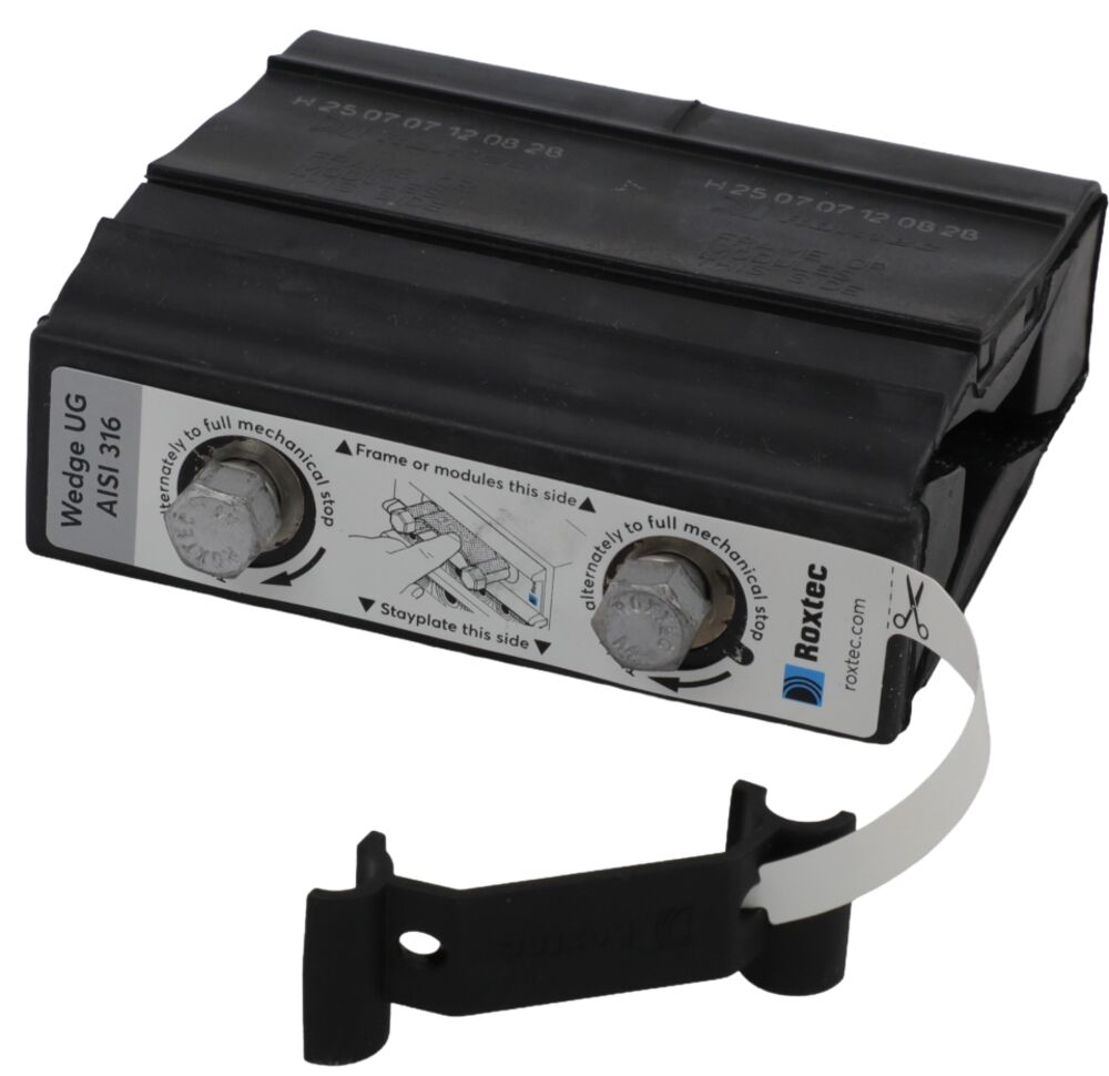 El Roxtec Wedge se utiliza en marcos con espacios útiles de sellado rectangulares y para sellar la instalación de cables, tuberías, módulos y placas de separación. El Roxtec Wedgekit contiene todos los componentes necesarios para la compresión del sistema.
