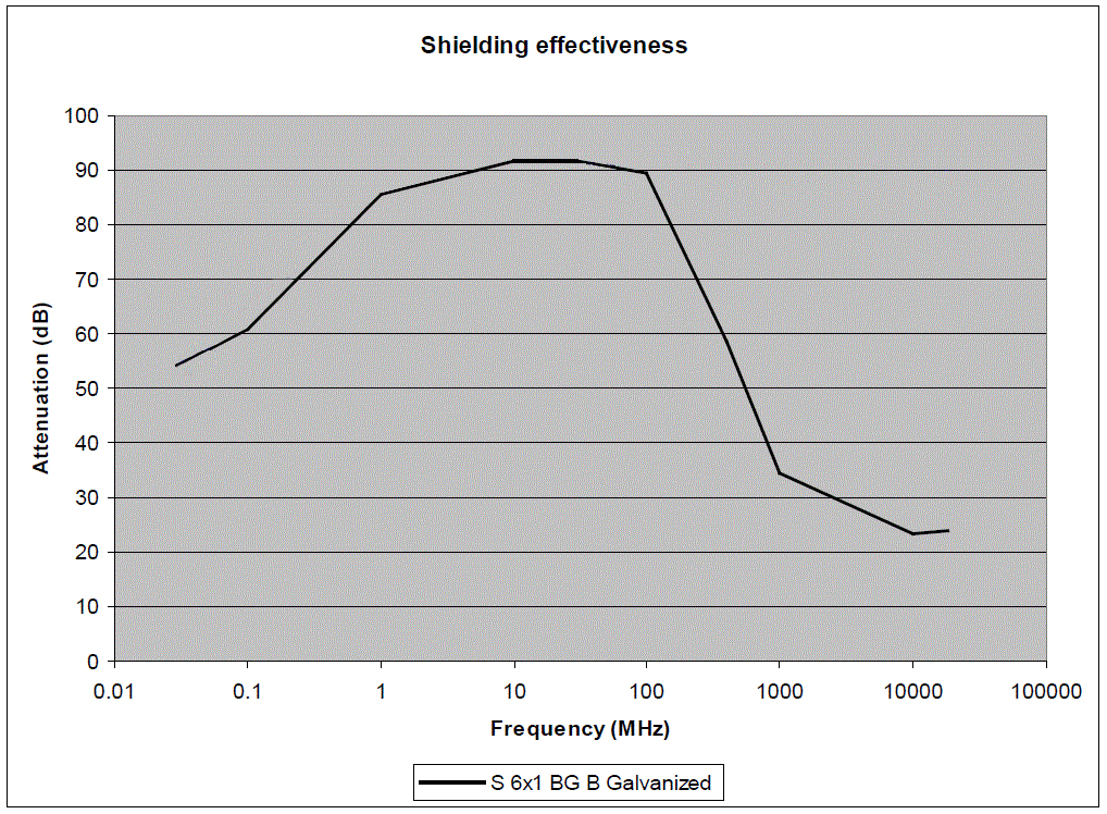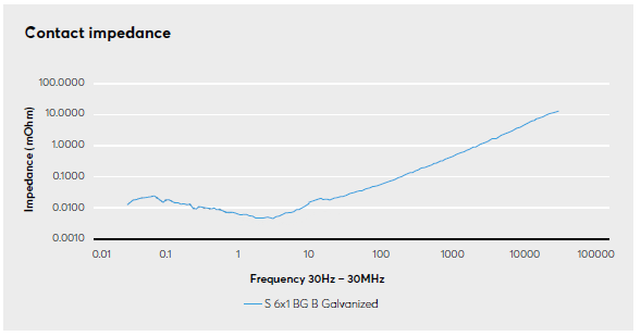 Järjestelmän sisäänrakennettu ominaisuus, joka toimii suojaavana tekijänä ilman erillisiä kustannuksia, on integroidun sidospunoksen hyödyllinen geometrinen muoto. Yhdessä järjestelmässä tarvittavan lyhyen johdinpituuden kanssa tuloksena on erittäin alhainen impedanssi. Mitä leveämpi johdin, sitä paremmat suojausominaisuudet – tämän nyrkkisäännön mukaan mitä korkeampi taajuus on, sitä enemmän signaalit pyrkivät etenemään vain materiaalin pinnalla. Lisäksi lyhyt johdin tuottaa alhaisen impedanssin, mikä on tärkeää suojattaessa armeerattuja ja suojattuja kaapeleita johtuvilta suurtaajuuksisilta häiriöiltä. Leveä ja lyhyt johdin tarjoaa siis tehokkaan toiminnallisen maadoituksen korkeataajuisia häiriöitä vastaan, mikä on ratkaisevan tärkeää sähkömagneettisen yhteensopivuuden ja sähkömagneettisilta häiriöiltä suojaamisen kannalta. Armeeratun kaapelin tai metalliputken kautta johtuvat sähkömagneettiset häiriöt ohjataan tehokkaasti maadoitukseen, eikä sähköturvallisuus vaarannu. Roxtec BG™ ‑järjestelmä on erittäin tehokas ratkaisu sähkömagneettisiin suojaustarkoituksiin jopa 100 MHz:iin asti.