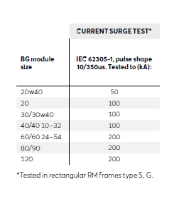Taulukosta käyvät ilmi kuparin poikkipinta-ala kunkin kokoisessa moduulissa ja suojaustason edellyttämä virta, jolla rakenne on testattu. Tämä on teknisten tietojen osion sisältämistä tiedoista.
