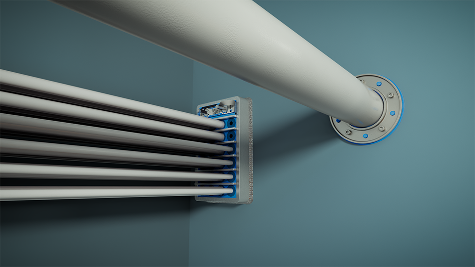 Roxtec 貫通部は衝撃波にも耐性があります。シールを構成する高品質のゴムは、細い油圧管を振動からも守ることができるので効率的なソリューションです。 この複数の電線・パイプを密閉できる貫通部は、過酷な海上環境での使用が認められている材質で作られています。 Roxtec シールを使うと、安全基準が定められている船舶の構造体に、様々な油圧管を切断せずに貫通させることができます。