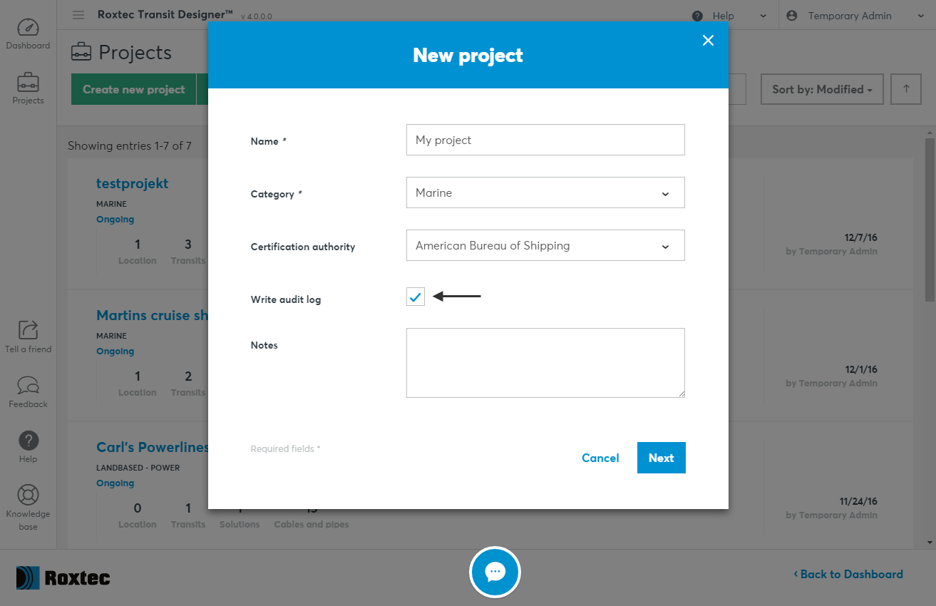 Al crear un proyecto puede habilitar la función "Mantener registro de auditoría". Esto creará un libro de registros con todas las actividades del proyecto con la fecha, la hora y la persona. En cualquier momento puede exportar el registro como parte del informe de lista de materiales en Excel.