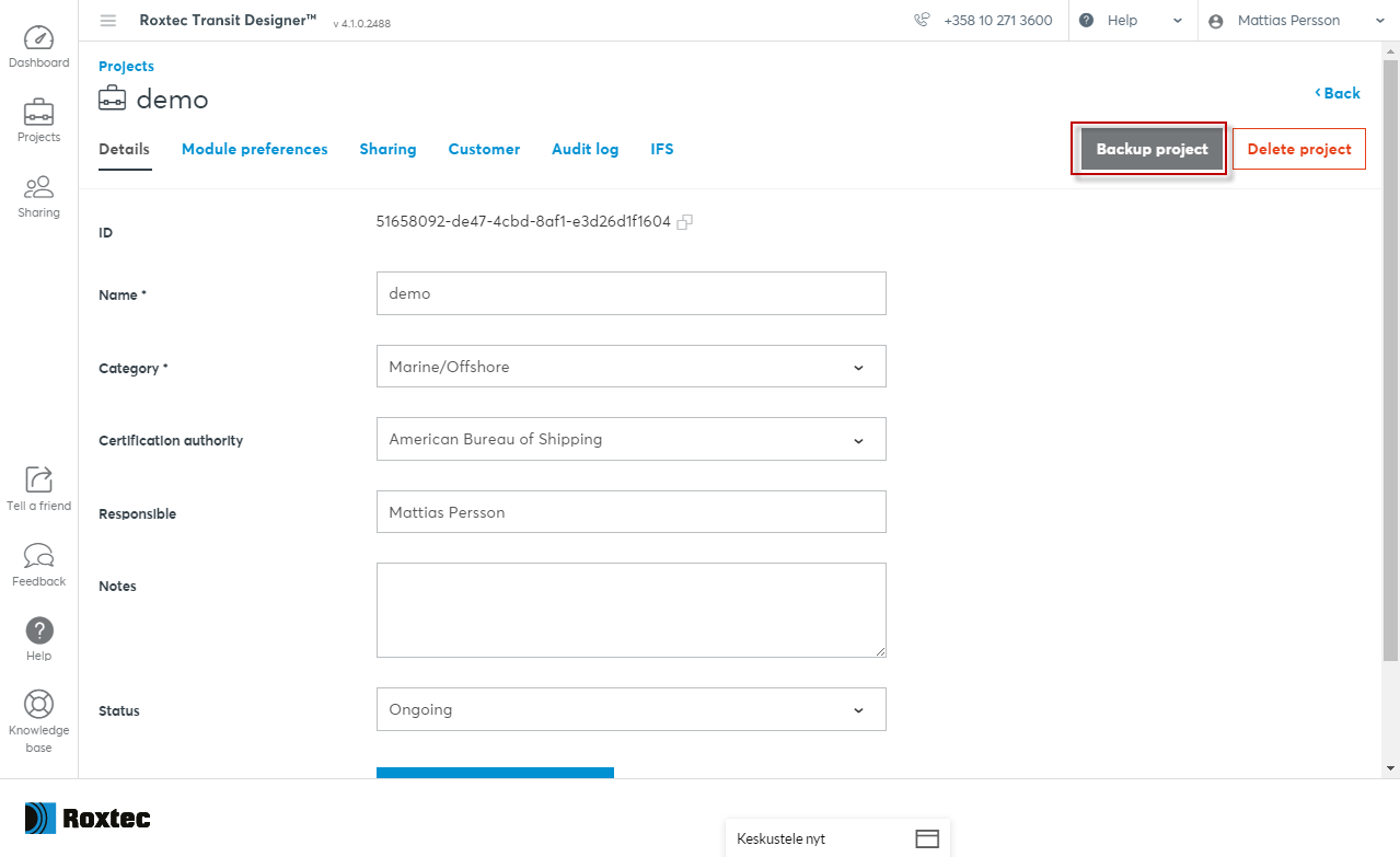 Klikk sikkerhetskopiknappen og en fil med et komplett prosjektinnhold vil bli generert.
