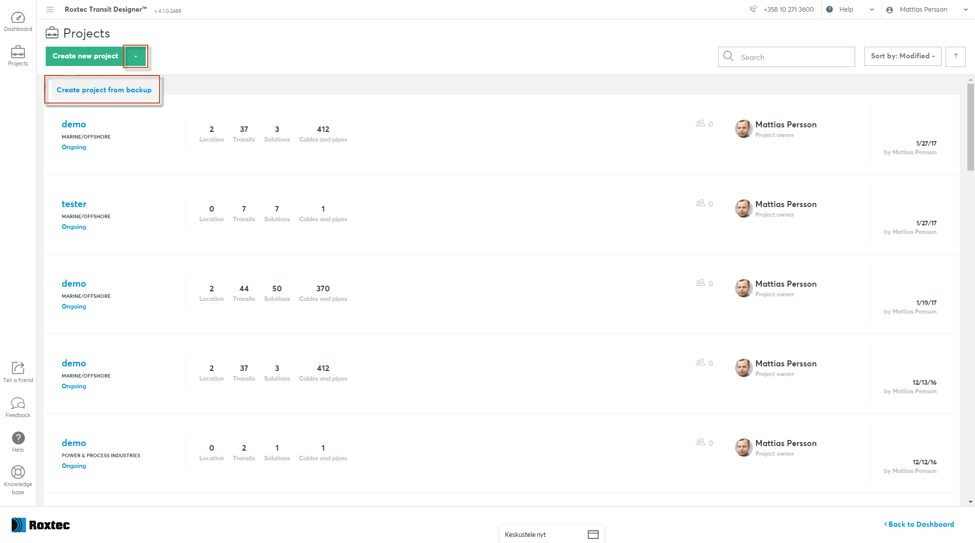 Du kan nå lage et nytt prosjekt basert på denne filen. For å gjøre dette, klikk på pilen i "lag nytt prosjekt"-knappen og velg "lag ny fra sikkerhetskopi".